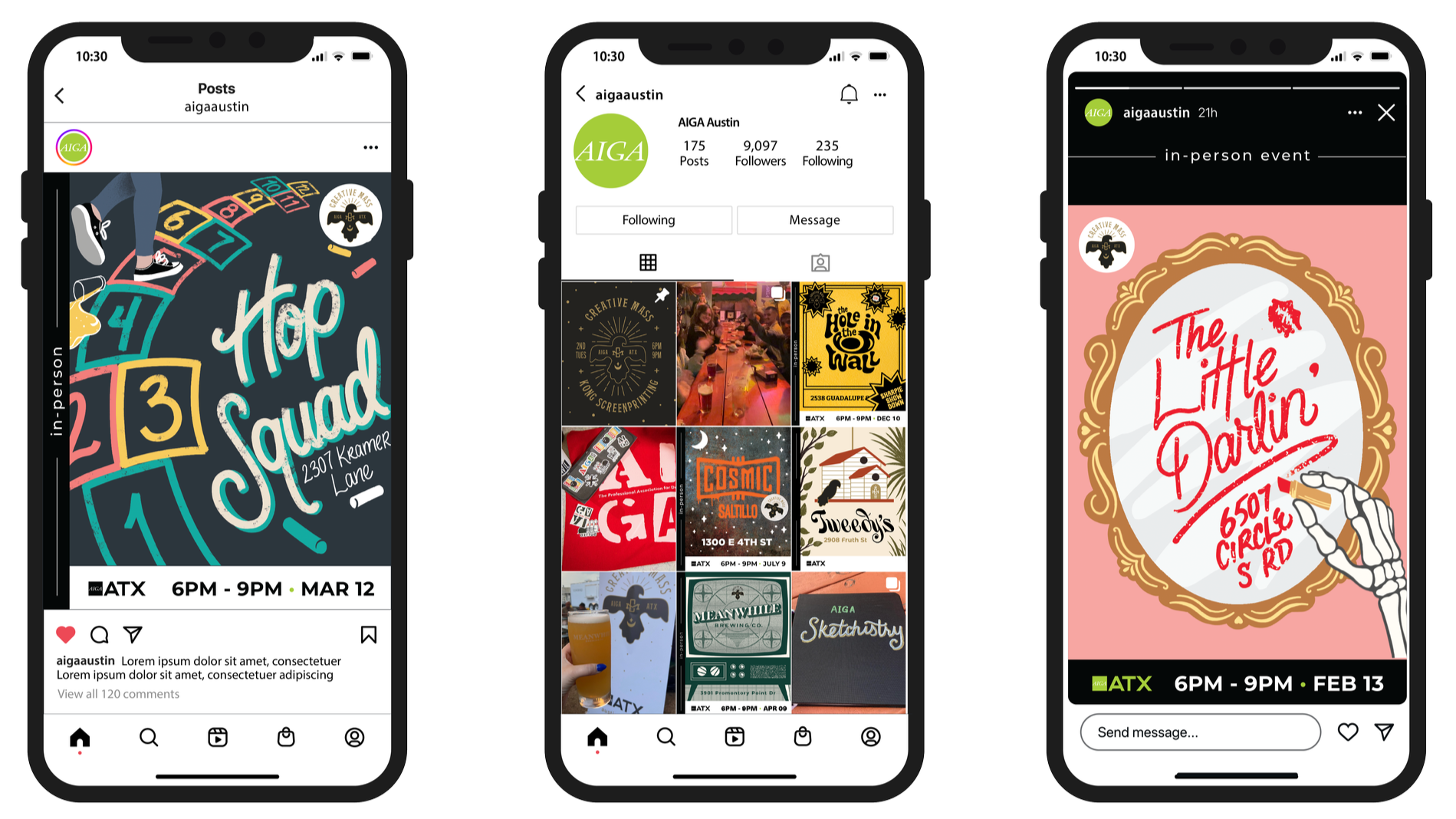 Working with AIGA Austin as the Creative Mass Chair, I’ve created graphics for the program’s monthly networking event since November 2022. I personally organized the meeting location and created unique graphics to cater to each each event. At times, I organized special projects that included mini workshops. To this day, I continue to work with the organization to bring creative individual’s together and maintain engagement for the community. Below is a collection of some of my favorite graphics I created for these events.